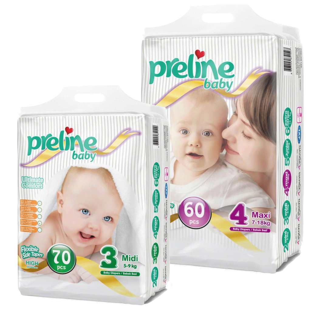 Preline premium baby diapers gently cover the babies waist with elastic wings; distributor the liquid equally with extra soft upper surface, breathable textile bottom surface and provide dryness up to 12 hours. Preline baby diapers gives freedom all day and maximum dryness all night. All the raw materials that we use are dermatologically tested and %100 safe to use. Preline baby diapers are producing with latest technology without a human touch. Babies skin’s are so sensitive and our diapers protect them without any perfume, chemical and lotion. Babies are happy with preline!