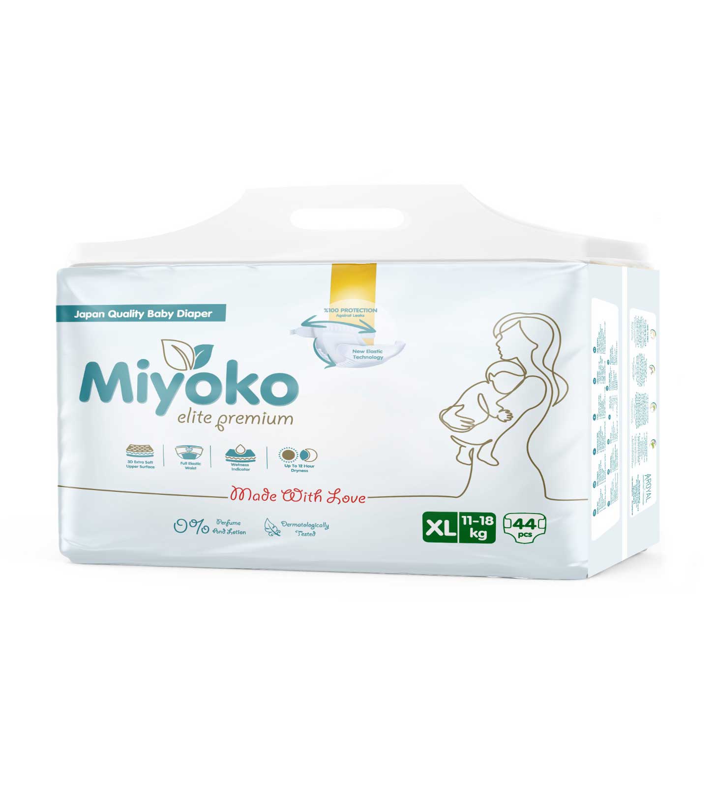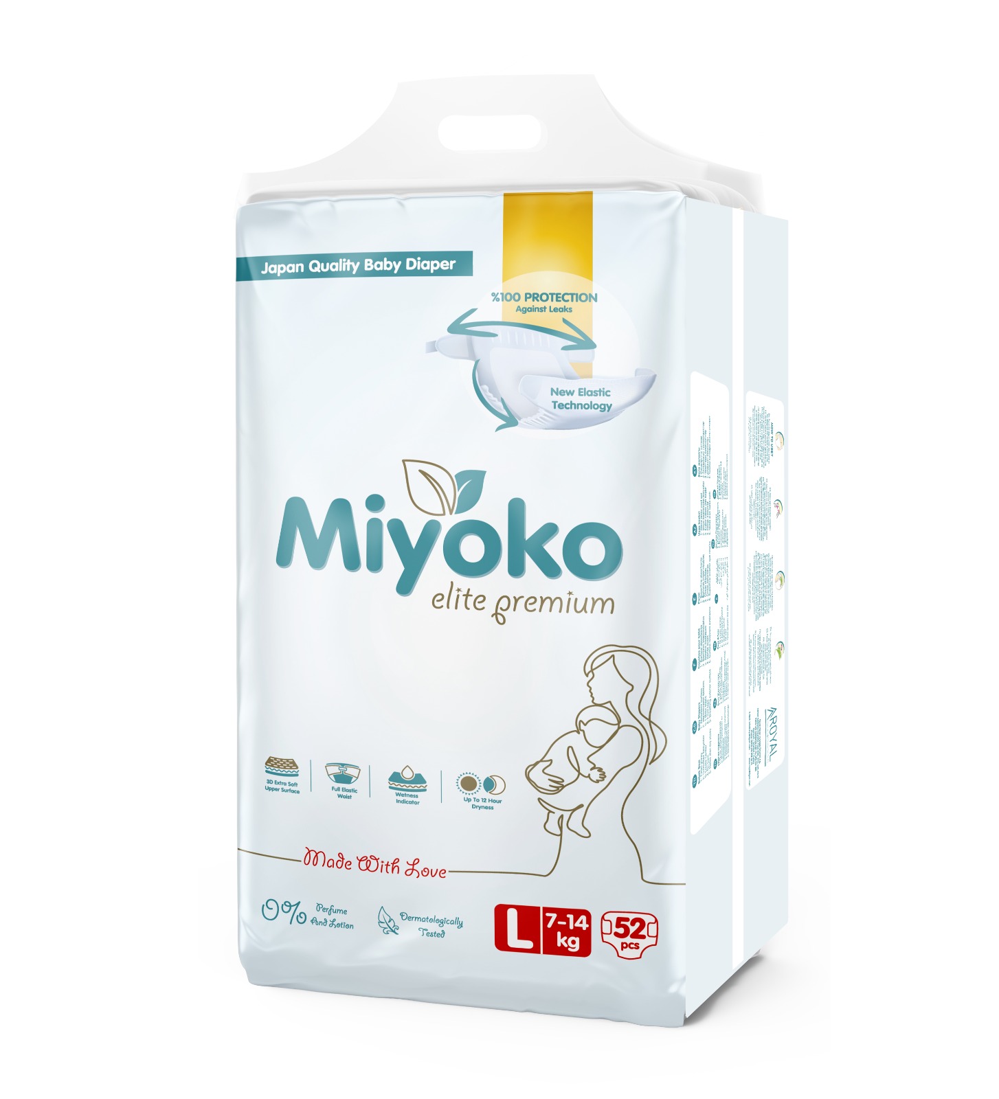 Miyoko diapers feature elastic Japanese technology that gently hugs your baby’s waist, a soft 3-dimensional top surface that evenly distributes liquid, a breathable textile outer surface and a high absorption capacity that provides up to 12 hours of dryness. Miyoko diapers provide free movement during the day and maximum dryness throughout the night.