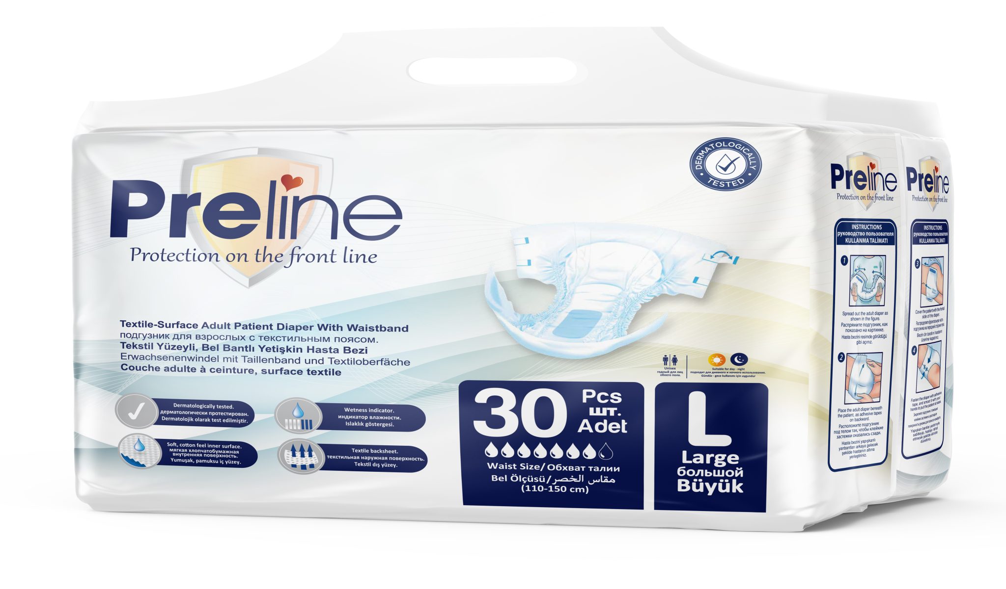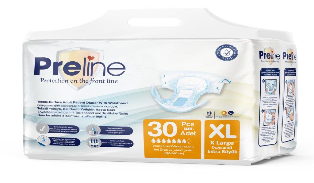 Preline adult patient diapers gently wrap around the waist thanks to the double side band and prevent leakage in case of movement. It has a soft top surface that distributes the liquid evenly, a breathable textile outer surface and a high absorption capacity that provides dryness for up to 12 hours. In addition, Preline adult diapers, which can be easily controlled with a liquid indicator, provide free movement during the day and maximum dryness throughout the night. All raw materials we use in our adult diapers are dermatologically tested and produced in our state-of-the-art production facility without human touch.